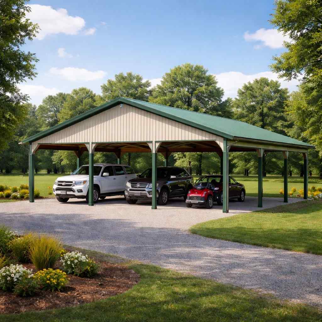 Multi-vehicle carports are built to accommodate multiple cars, trucks, or equipment, with spacing and structural support planned to maintain accessibility and safe vehicle movement.